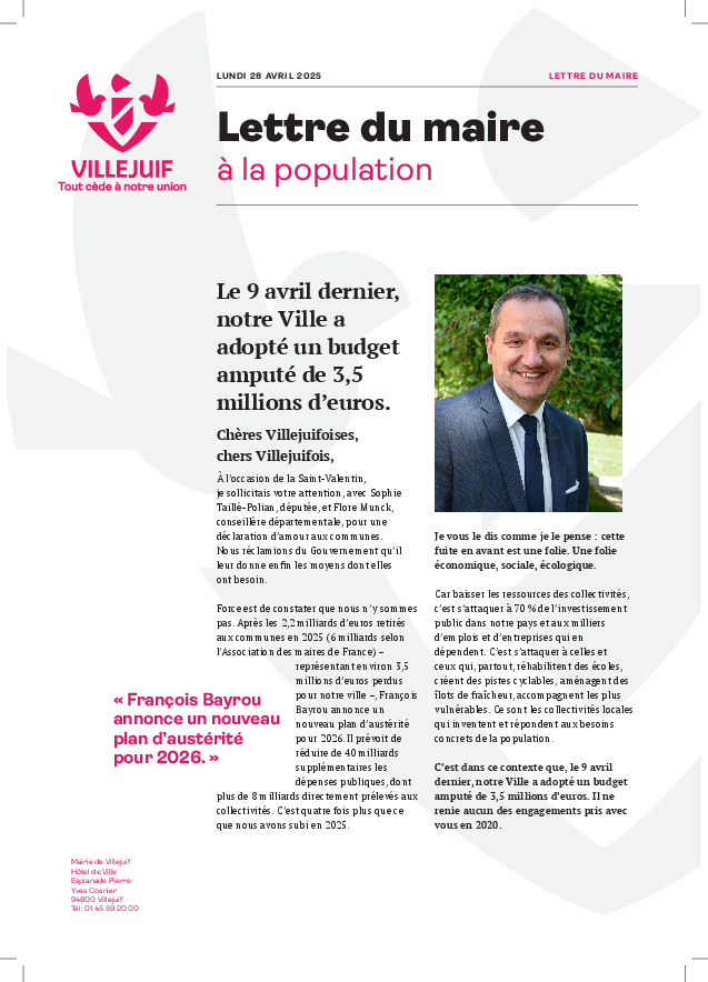 On dit souvent « quand on aime, on ne compte pas ». Hélas, l’amour du gouvernement Bayrou semble réservé aux grandes fortunes et aux agences de notation, bien plus qu’aux communes et aux services publics. Et cet amour-là nous coûte cher : à Villejuif, nous perdons entre 3 et 5 millions d’euros, directement ou par de nouvelles charges imposées.